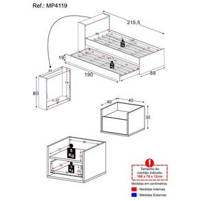 Dimensões do produto montado: Mesa de Cabeceira - Altura: 30cm | Largura: 40cm | Profundidade: 40cm Bicama - Altura: 80,5cm | Largura: 215,5cm | Profundidade: 110cm (aberta) 88cm (fechada) Colchões Indicados: 188cm x 78cm x 12cm *Você pode consultar as medidas detalhadas na imagem técnica do produto.
