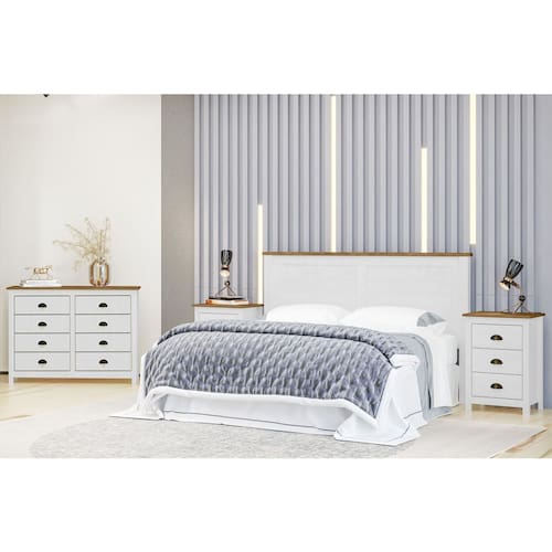 Conjunto Quarto: Cabeceira, Cômoda 8 Gavetas e 2 Mesas de Cabeceiras Topázio Branco/Freijó Madeira Pinus - Finestra