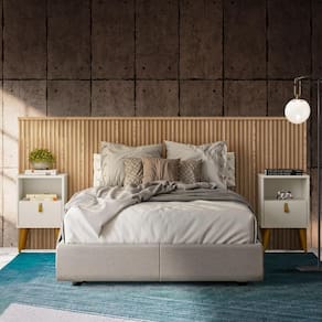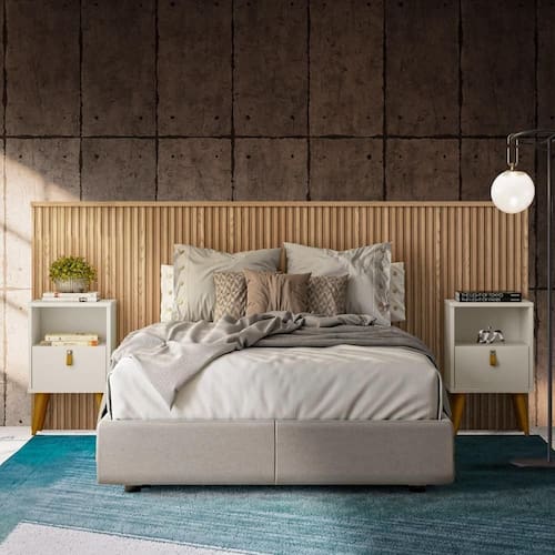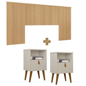 - Conjunto inclui uma cabeceira ripada e 2 mesas de cabeceira