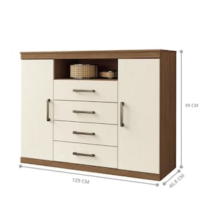 A Cômoda conta com quatro gavetas amplas para organizar todas suas roupas, possui uma prateleira, três nichos, duas portas e um cabideiro.