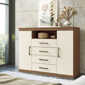 A Cômoda conta com quatro gavetas amplas para organizar todas suas roupas, possui uma prateleira, três nichos, duas portas e um cabideiro.