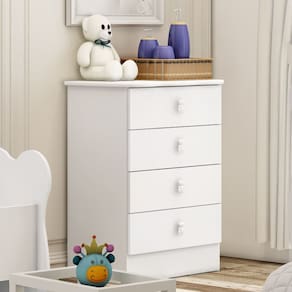 Comoda Material: MDP 15 mm Acabamento: LACCA Gavetas: 04 Tipo de corredicas: Telescopica Puxadores: 04 unidades Tipo de puxadores: PVC formato de urso Sapatas: 04 unidades Tipo de sapata: Plastica Peso recomendado: 20 kg / 02 kg Bordas: Papel/PVC