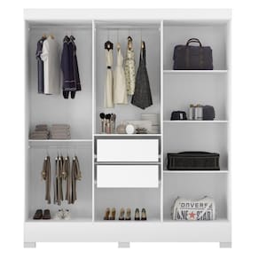 O guarda roupa se destaca pela configuração interna, oferecendo excelente com duas gavetas e diversas possibilidades para utilização das prateleiras e três cabideiros metálicos para roupas longas. Possui 6 portas e 2 gavetas internas, todas com corrediças telescópicas