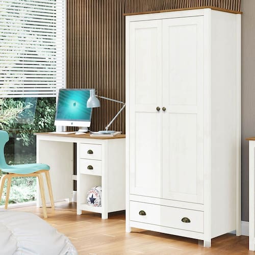 Conjunto Quarto Guarda-Roupa 2 Portas, Escrivaninha 2 Gavetas Topázio Branco/Freijó Madeira Pinus - Finestra