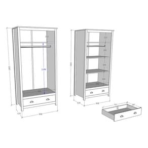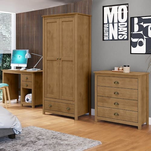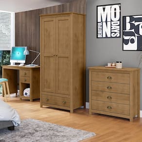Conteúdo da Embalagem: 1 Guarda-Roupa, 1 Escrivaninha, 1 Cômoda, manual de montagem e Kit Ferragem