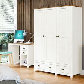 Conjunto Quarto: Guarda-Roupa 3 Portas, Escrivaninha 2 Gavetas Topázio Branco/Freijó Madeira Pinus - Finestra