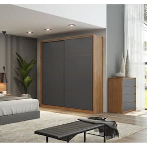 O Guarda Roupa traz em seu design a união da beleza, funcionalidade e versatilidade, possui 2 portas de correr e 3 gavetas, todas com corrediças telescópicas e profundidade adequada para roupas e sapatos.