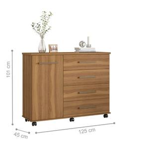 A cômoda dispõe de 4 gavetas, com profundidade excelente para acomodar todas as suas roupas. Possui também uma porta, com prateleira e cabideiro interno.