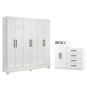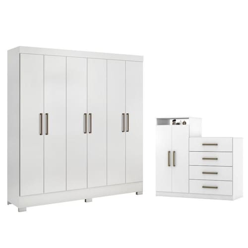 Conjunto Quarto Guarda Roupa E Comoda Ferrara Branco Este conjunto une design e funcionalidade, para deixar seu quarto ainda mais elegante e organizado! O guarda roupa traz um design imponente que valoriza o ambiente com medidas internas amplas e com espaços bem distribuídos para uma boa acomodação de roupas e objetos.