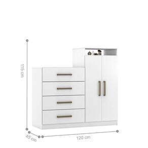 A cômoda é perfeita para pequenos ambientes, ela conta com quatro gavetas espaçosas e um armário de duas portas, com duas prateleiras internas. Ainda conta com um nicho na parte superior, para itens menores ou objetos de decoração
