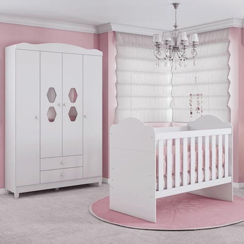 Conjunto Quarto Infantil Berço Yupi e Guarda-Roupa 4 Portas Lolly Branco. Móveis Estrela produz seus berços respeitando a norma de segurança NBR da ABNT que impedem os riscos, favorecendo a segurança do bebê e o bem-estar da família. Berço Mini-Cama Yupi é multifuncional, após seu bebê crescer poderá utilizar como mini-cama montessoriana ou Mini-Cama. Berço Mini-Cama Yupi irá compor o quartinho do seu bebê com elegância e delicadeza. Ean: 7893530142417
