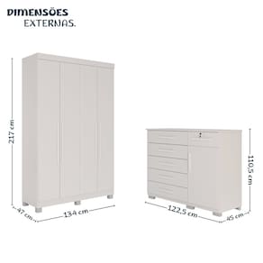 Leve funcionalidade e charme ao quarto infantil com este conjunto composto por guarda-roupa e cômoda. O guarda-roupa oferece organização com 3 gavetas internas, cabideiro em alumínio e corrediças telescópicas que garantem praticidade no dia a dia, além de puxadores amadeirados que adicionam um toque acolhedor. Já a cômoda conta com 6 gavetas espaçosas, sendo uma com chave para maior segurança, também equipada com corrediças telescópicas e puxadores no mesmo padrão, além de acompanhar kit de pés, unindo estilo e versatilidade ao ambiente. Ambiente Principal: Quarto Infantil codigo_ean: 7900288210319 Complexidade da Montagem: Alta: deve ser montado por um montador especializado Cor: Branco Cor do Produto: Branco Escala de Brilho: Semi-Fosco Linha ou Coleção: Sofia Manual de Montagem e Instalação: https://cdn2.madeiramadeira.com.br/atributo/benetil-moveis/3101457-4938-17537347924272.pdf Marca: Espresso Móveis Material Principal: MDP Medida de Cada Item: Roupeiro: Altura; 217 / Largura; 134 / Profundidade; 47. Cômoda: Altura; 110,5 / Largura; 122,5 / Profundidade; 45 modular: Não Necessita Montagem: Sim Origem do Produto: Nacional Peso: 154.9 Recomendações de Uso, Manutenção e Limpeza: Limpeza com pano macio e levemente umedecido. Não utilizar solventes a base e de inflamáveis. Não utilizar produtos abrasivos. Sistema de Montagem: Parafusos e cavilhas Suporta Até (kg): 75
