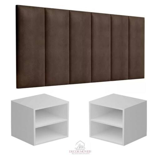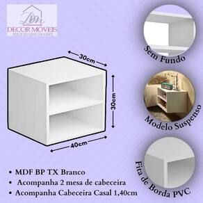 Conjunto Quarto Mesas De Cabeceira + Cabeceira De Cama 1,40 Kit cabeceira estofada 1,40cm casal + 2 mesa de cabeceira ecos Itens inclusos: 1 Cabeceira 1,40cm casal 2 Mesa de Cabeceira Ecos Branco 1 Kit de instalação de ambas as peças 1 Manual de instruções A cabeceira estofada traz conforto térmico, acústico e beleza para seu quarto, sendo hoje o item de decoração mais indicados por 9 em cada 10 profissionais de decoração.Seu estofado é macio ao toque e ideal para quem gosta de ler antes de dormir ou tomar café da manhã na cama. Além disso, este tecido é resistente ao desgaste e a outros fatores, como à luz e a umidade. Dimensões Cabeceira 140cm Altura 54 cmLargura 140 cmProfundidade 5 cm Mesa de Cabeceira Ecos suspenso em MDF de primeira qualidade com resistência e acabamento de alta durabilidade. Este modelo é ideal para organização de uma maneira moderna e funcional, trazendo um ar de sofisticação e elegância para qualquer decoração de vários tipos de ambientes. Sugestões: quartos, salas, cozinhas, escritórios etc. Especificações: Confeccionado em MDF 15mm de primeira qualidade com resistência e acabamento de alta durabilidade. Produto100% MDF MDF Branco Medidas: 30cm Altura30cm Profundidade30cm LarguraSuporta até 30kg.