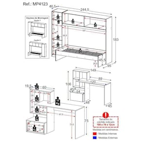 Dimensões do produto montado: Escrivaninha - Altura: 106cm | Largura: 149cm | Profundidade: 48cm Cama com Guarda-Roupas - Altura: 183cm | Largura: 244,5cm | Profundidade: 95cm Colchões Indicados: 188cm x 88cm 12cm *Você pode consultar as medidas detalhadas na imagem técnica do produto.