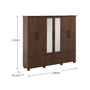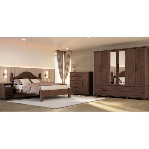 Conjunto Quarto Ouro: Guarda-Roupa 6 Portas, Cama Queen, Cômoda Sapateira e 2 Mesas Cabeceiras Café Madeira Pinus