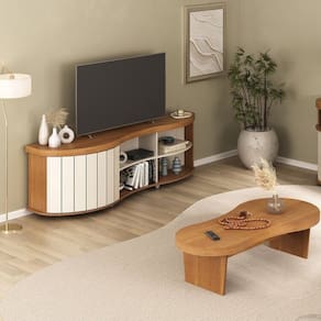 A Mesa de Centro Magnum é a combinação perfeita de funcionalidade e design, transformando sua sala em um espaço elegante e acolhedor. Com seu tampo em Tamburato curvo de 50cm, ela impressiona pela robustez e pelo acabamento refinado que exala modernidade. Seu design orgânico atual e exclusivo traz fluidez e leveza, enquanto a estrutura em MDF de 15cm, com pintura UV de alta qualidade, garante resistência e durabilidade. Transforme sua sala com o Rack Magnum, um móvel que une funcionalidade e design de forma impecável. Seu robusto tampo curvo em Tamburato de 50cm oferece segurança para TVs de até 75?, enquanto a porta ripada deslizante e curva exala sofisticação e modernidade. A praticidade brilha com a porta reversível, que permite escolher a cor durante a montagem. Altura do Conjunto: 55.5 cm Ambiente: null Ambiente Principal: Sala de Estar Cor: Cinamomo/Off White Informação Complementar: 1x Mesa de Centro Design Orgânico Tampo em Tamburato 50mm Magnum COR Carvalho Cinamomo Largura: 120 cm Altura: 34 cm Peso: 13 kg Profundidade: 60 cm Necessita Montagem: Sim