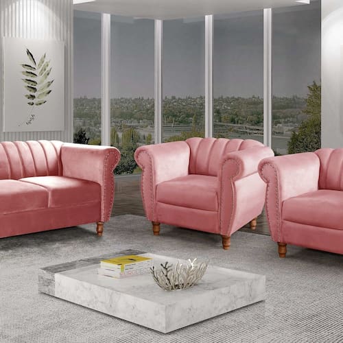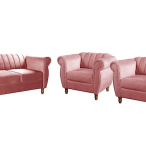 É necessário que haja uma ou mais pessoas no local para receber, desembalar, e conferir o produto. Produto Montado: Sim Acompanha Almofadas extras: Não Almofada do assento: Removível Almofada do encosto: Não Possui Altura do assento até o chão: 45.0000 Altura do Encosto: 80 cm Ambiente Principal: Sala de Estar codigo_ean: 7909903799932 Complexidade da Montagem: Baixa: pode ser montado por uma pessoa sozinha Cor: Rosa Cor do Produto: Rosa Estilo de Braço: Braços Redondos Informações Complementares: 120Kg por acento Itens Inclusos: 1 Sofá 2 Lugares Realeza + 2 Poltronas 1 Lugar + Pés Necessita Montagem: Sim Origem do Produto: Nacional Peso: 50 kg Pet Friendly: Não Possui Percintas Elásticas: Sim Possui Pés: 04 Possui Rodízio: Não Quantidade de Itens: 3 Recomendações de Uso, Manutenção e Limpeza: Limpeza e cuidados: pode ser utilizado aspirador de pó, escova com cerdas macias ou limpeza a seco. Não utilizar produtos químicos, abrasivos ou limpeza a vapor. Evitar exposição prolongada ao sol. Sistema de Montagem: Fixar os Pés Suporta Até (kg): 120 kg Tecido Predominante: Suede Tipo de Encosto: Fixo Tipo de Mola: Molas Ensacadas (Molas ensacadas)