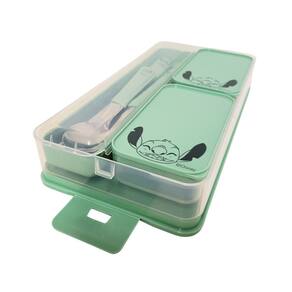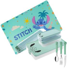 -Kit completo e funcional: Contém 1 marmita retangular de 700ml, 2 potes multiuso de 80ml, 1 jogo de talheres (garfo, faca e colher) em aço inox, 1 estojo para talheres e 1 Lugar Americano PVC Stitch.