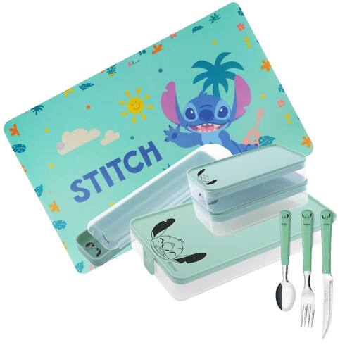 Itens inclusos: 1 marmita, 2 potes multiuso, 1 garfo, 1 faca, 1 colher e 1 estojo para talheres, 1 lugar americano Stitch.