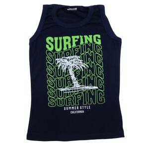 Camiseta Regata Azul Marinho: Confeccionada em meia malha 100% algodão, a regata traz uma estampa vibrante de surfing, que encanta os pequenos amantes do esporte. O tecido leve e respirável proporciona conforto em todas as atividades, desde brincadeiras até passeios.