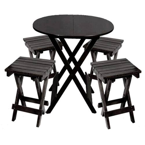 Conjunto De Mesa Dobravel De Madeira 60cm Redondo Com 4 Banquinhos Dobraveis PretoTenha um pacote completo de praticidade com este conjunto, ideal para restaurantes, bares, estabelecimentos comerciais, áreas de lazer ou até mesmo para sua casa. Feito em madeira maciça, resistente e durável. Seu design permite que seja encaixado em vários ambientes trazendo um toque estético a mais ao mesmo. Além de estética, este conjunto de mesas e cadeiras também garante praticidade de locomoção dos produtos e longa durabilidade.ATENçãO: EVITE USAR PRODUTOS ABRASIVOS E QUíMICOS PARA LIMPEZA DO PRODUTO, aconselha-se o uso de pano umedecido para melhor conservação; mantenha o produto fora de chuva e sol constantes.Matéria prima:Madeira Maciça, de alta densidade e resistente.Sua variação de tonalidades é uma característica típica desta madeira, podendo apresentar diversos tons num mesmo produto em harmonia com o brilho do verniz.Modelo: DobrávelCor: Preto Dimensões (Mesa): Altura 90cm / Largura e Profundidade 60cm (Diâmetro)Dimensões (Cadeiras): Altura 55cm / Largura 31cm / Profundidade 29cmConjunto Restaurante de Mesa Dobravel de Madeira 60cm Redondo com 4 Banquinhos Dobraveis Preto