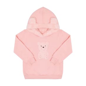 Este é o conjunto que vai unir conforto e estilo, um look ideal para os momentos de diversão com as amiguinhas. Blusão em moletom na cor rosê possuí forro em pelo, capuz com orelhinhas e estampa de aplique bordado de urso, deixando sua pequena ainda mais fofinha. A calça em moletom na cor rosê possuí elastano na cintura e na canela, deixando os momentos divertidos ainda mais confortáveis.\n