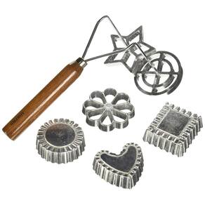 - Conjunto de 7 peças: cabo de madeira com dois pinos com moldes de alumínio fundido: 3 rosetas e 3 timbales.