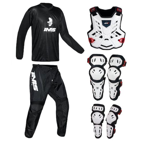 Kit conjunto combo Calça Camisa Ims Mx Preto e Colete, Joelheira, Cotoveleira Control Amx Branco/ Preto proteção protetor trilha, motocross, enduro, velocross, cross-country, Freestyle, Downhill, Mtb joelho e cotovelo, coxa, peito, costa, ombros.
