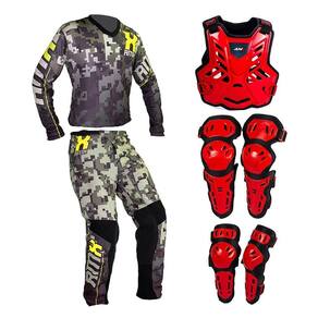Kit conjunto combo Amx Calça Camisa Camuflada Verde Neon Classic e Colete, Joelheira, Cotoveleira Control Vermelho/ Preto proteção protetor trilha, motocross, enduro, velocross, cross-country, Freestyle, Downhill, Mtb joelho e cotovelo, coxa, peito, costa, ombros.