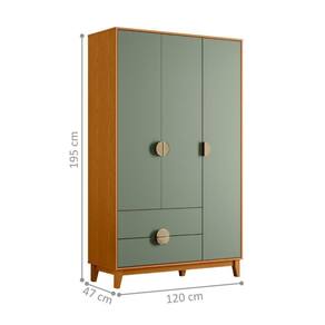 O guarda roupa é feito em 2 gavetas com corrediça telescópicas, 3 portas, 1 cabideiros e 5 prateleiras