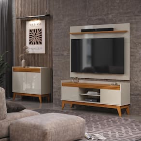 Com um designer moderno e sofisticado ele acompanha um Painel para Tv de até 50 polegadas desenvolvido em MDP, Pintura UV, 1 prateleira superior de 25mm e furação passa fio, composto também por nosso Rack que possui um tampo em MDP de 25mm, pé em MDF e 2 portas, já o nosso Buffet é encantador com uma estrutura em MDP, 2 portas articuladas em MDF, 2 prateleiras internas, tampo superior com acabamento ripado frontal, e pintura UV.