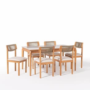 Desenvolvida para quem deseja mais acolhimento no décor, o conjunto Florença é Perfeito. Ele é composto por 6 cadeiras com encosto em corda Náutica na cor Rami e assento estofadas e 1 mesa de tampo laminado com encabeçamento em madeira maciça com vidro na cor off White de 1,60. Por ser produzida com madeira maciça de eucalipto reflorestado e acabamento Verniz mel, juntamente com o tecido claro na cor cru 06 , proporciona um ambiente com estilo luminoso, arejado e acolhedor. É Ideal para sua cozinha e sala de jantar, formando um ambiente de bem estar perfeito para desfrutar junto de família e amigos uma refeição maravilhosa. Medida da Mesa (A x L x P): 76 x 160 x 90 Peso da Mesa: 30 kg Mesa suporta até: 50 kg Acabamento da Cadeira/Banco: Verniz Natural Acabamento da Mesa: Verniz Ambiente Principal: Sala de Jantar Cadeira/Banco estofada: Somente Assento Estofado Cadeira/Banco Estofada: Somente Assento Estofado Cadeira/Banco Suporta Até: 120.0000 Cadeira/Banco suporta até: 120 kg codigo_ean: 7900288285829 Complexidade da Montagem: Baixa: pode ser montado por uma pessoa sozinha Cor: Mel/Areia/Cru/Off White Cor do Produto: Mel/Areia/Cru/Off White Cor Secundária: Bege De Canto (Canto Alemão): Não Escala de Brilho: Semi-Brilho Espessura do Tampo: 35 mm Estrutura do Assento: MDF/Espuma Formato do Tampo: Retangular Informações Complementares: Este produto foi pensado e desenvolvido para elevar a decoração do seu ambiente interno e trazer um ar de sofisticação para sua sala de jantar. É recomendado seguir as instruções de manutenção e acabamento que acompanham a embalagem. Itens Inclusos: 1 Mesa, 6 Cadeiras, Kit Ferragem e Manual de Montagem Linha ou Coleção: Florença Manual de Especificação Técnica: https://product-hub-prd.madeiramadeira.com.br/475630051/documents/4eaac044-b6a9-4816-a41e-e4b41c55061c3309704293217621799814252.pdf Manual de Montagem e Instalação: https://product-hub-prd.madeiramadeira.com.br/475630051/documents/5cb18dd0-7ec3-4080-9b6f-45b5743727943309705293217621801470834.pdf Marca: Casa e Jardim Móveis Material da Base da Mesa: MDF/Madeira Maciça Material da Estrutura da Cadeira: Madeira Maciça Material do Tampo: Vidro/MDF Medida da Cadeira/Banco (A x L x P): 88 x 48 x 51 Medida do Tampo (L x C x E): 160 x 90 x 3,5 Mesa Extensível: Não Necessita Montagem: Sim Origem do Produto: Nacional Peso da Cadeira/Banco: 6,5 kg Possui Apoio Para os Pés: Não Quantidade de Cadeiras: 6 Quantidade de Lugares: 06 Recomendações de Uso, Manutenção e Limpeza: Utilizar em ambiente interno. Os tampos das mesas são de MDF com encabeçamento em madeira maciça, evite molhar ou deixar líquidos por muito tempo para que não ocorra bolhas.o expor ao sol e chuva. Cuidados e limpeza : Retire o pó com uma flanela macia, seca ou levemente umedecida. Passe uma esponja macia e levemente umedecida. Não utilizar álcool ou produtos químicos, abrasivos ou solventes. Sistema de Montagem: parafusos , mas somente a mesa, as cadeiras já vão montadas