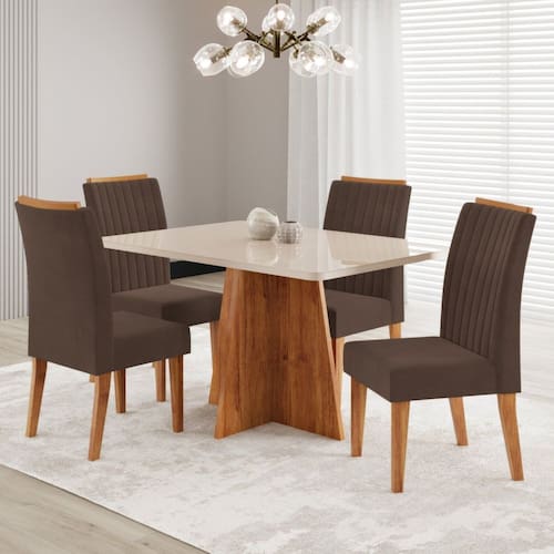 Transforme sua sala de jantar com este elegante conjunto que une estilo e conforto. A mesa de 120x80cm possui tampo em MDF de 1,8cm com vidro, oferecendo resistência e sofisticação ao ambiente. Sua base em formato “X”, feita em MDP, traz um design moderno e robusto. As cadeiras acompanham essa elegância, confeccionadas em MDP/MDF, com estrutura firme e durável. O destaque fica para o revestimento em tecido veludo, que proporciona um toque macio e refinado. Ideal para reunir a família com charme e aconchego. A combinação de materiais garante beleza e funcionalidade para o dia a dia. Perfeito para quem valoriza ambientes bem decorados e acolhedores. Uma escolha inteligente para transformar refeições em momentos especiais. Sofisticação que cabe no seu lar! Medida da Mesa (A x L x P): A:77,8 x L:120 x P:80cm Peso da Mesa: 46,4 kg Mesa suporta até: 50 kg Acabamento da Cadeira/Banco: Pintura UV Acabamento da Mesa: Pintura UV Acompanha Manual de Instalação: Sim Ambiente Principal: Sala de Jantar Cadeira/Banco Estofada: Encosto e Assento Estofados Cadeira/Banco estofada: Encosto e Assento Estofados Cadeira/Banco suporta até: 90 kg codigo_ean: 7900288185914 Complexidade da Montagem: Média: pode ser montado por mais de uma pessoa e/ou necessite de maior conhecimento para montagem Configuração do Conjunto: Mesa com Cadeiras Cor: Mel/Off White/Bombom Cor das Cadeiras: Bege Cor do Produto: Mel/Off White/Bombom Cor Secundária: Bege De Canto (Canto Alemão): Não Enchimento do Assento: Espuma D-26 Escala de Brilho: Semi-Brilho Espessura do Tampo: 18 mm Estrutura do Assento: MDP Estrutura do Encosto: MDP Formato do Tampo: Retangular Informações Complementares: Sala de Jantar 4 lugares Itens Inclusos: 1 Mesa, 4 Cadeiras, Kit Ferragens e Manual de Montagem Linha ou Coleção: Tannat Manual de Montagem e Instalação: https://product-hub-prd.madeiramadeira.com.br/351878536/documents/a43b443b-94c2-4a01-bb00-7cd4fa57e1fe303614452817513786451521.pdf Marca: Viero Material da Base da Mesa: MDP Material da Estrutura da Cadeira: MDF/MDP Material do Tampo: Vidro/MDF Material Principal: MDF/MDP Material Principal das Cadeiras/Bancos: MDF/MDP Medida da Cadeira/Banco (A x L x P): A:101 x L:42 x P:58,5cm Medida do Tampo (L x C x E): L:120 x C:80 x E:1,8cm Mesa Extensível: Não Necessita Montagem: Sim Origem do Produto: Nacional Peso da Cadeira/Banco: 8 kg Possui Apoio Para os Pés: Não Possui Vidro: Sim Quantidade de Cadeiras: 4 Quantidade de Lugares: 04 Recomendações de Uso, Manutenção e Limpeza: limpar com pano levemente umedecido em água Revestimento da Cadeira/Banco: Veludo Sistema de Montagem: Parafusos, cavilhas
