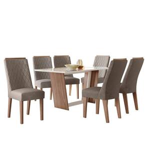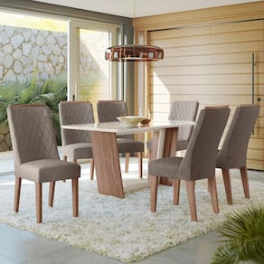 O conjunto Rubi destaca-se pela impressão dos detalhes amadeirados, replicando um design clean e despojado. O tampo em vidro da um toque de modernidade ao ambiente, deixando o espaço das refeições ainda mais charmoso. Os acabamentos oferecem maior qualidade e durabilidade ao móvel. Medida da Mesa (A x L x P): 79 x 84 x 156cm Peso da Mesa: 43.844 Mesa suporta até: 120 Acabamento da Cadeira/Banco: Pintura Texturizada Acabamento da Mesa: Pintura Texturizada Almofada do assento: Fixa Altura do Conjunto: 102 Ambiente Principal: Sala de Jantar Cadeira/Banco estofada: Encosto e Assento Estofados Cadeira/Banco suporta até: 120 Complexidade da Montagem: Média: pode ser montado por mais de uma pessoa e/ou necessite de maior conhecimento para montagem Cor: Amendoa Cor da Base: Marrom Cor do Produto: Amêndoa Cor do Tampo: Branco Cor Secundária: Marrom De Canto (Canto Alemão): Não Design da Base: Em V Enchimento do Assento: Espuma D-20 Enchimento do Encosto: Espuma D-20 Escala de Brilho: Fosco Espessura do Tampo: 37 Espessura do Vidro: mm Estrutura do Assento: MDF/Espuma Estrutura do Encosto: MDF Formato do Tampo: Retangular Itens Inclusos: 1 Mesa, 6 Cadeiras, Kit Ferragens e Manual de Montagem Linha ou Coleção: Rubi Manual de Montagem e Instalação: https://cdn2.madeiramadeira.com.br/atributo/celta-moveis/1357736-manual-conjunto-rubi.pdf Material da Base da Mesa: MDF Material da Estrutura da Cadeira: MDF/MDP Material do Tampo: Vidro/MDF Medida da Cadeira/Banco (A x L x P): 102 x 44,5 x 49cm Medida do Tampo (L x C x E): 84 x 156 x 3,7cm Mesa Extensível: Não Necessita Montagem: Sim Origem do Produto: Nacional Peso da Cadeira/Banco: 9.647500000000001 Possui Apoio para Braços: Não Possui Apoio Para os Pés: Não Possui Suporte Giratório: Não Quantidade de Lugares: 06 Recomendações de Uso, Manutenção e Limpeza: Limpeza com pano umedecido. Revestimento da Cadeira/Banco: Veludo Sistema de Montagem: Parafusos Vidro Temperado: Sim
