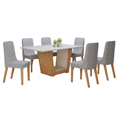 Conjunto Sala de Jantar 160cm Tampo MDF com Vidro e 6 Cadeiras Amêndoa Clean/Off White/Cinza - Marrom