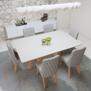 O Conjunto Apogeu 160cm transforma sua sala de jantar em um ambiente sofisticado e funcional. Perfeito para acomodação até seis pessoas, ele oferece o equilíbrio ideal entre beleza e praticidade. A mesa, com tampo de MDF com vidro, é resistente e de fácil manutenção, enquanto as cadeiras, confortáveis ??e elegantes, garantem o bem-estar durante os momentos à mesa. Ideal para jantares em família ou recepções com amigos, esse conjunto proporciona charme e durabilidade ao seu espaço.