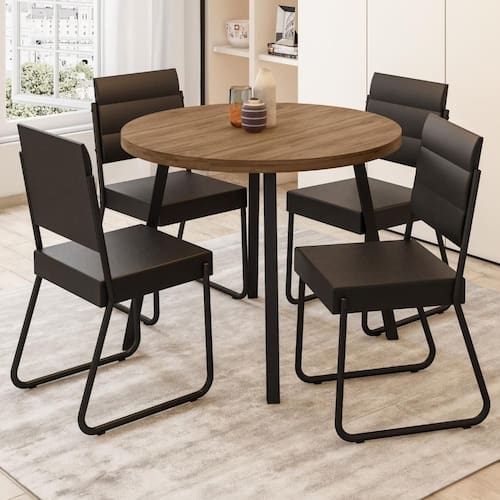 Altura das cadeiras (cm): 90 cm | Estado de Origem: RS | Cor Predominante: Preto | Cor do tampo: Nogal | Cor do assento: Preto | Cor da estrutura: Preto | Fabricante: Móveis Carraro | Marca: Móveis Carraro | Profundidade das cadeiras (cm): 52 cm | Quantidade de cadeiras: 4 | Largura das cadeiras (cm): 46 cm | Altura da mesa (cm): 76,5 cm | Comnto da mesa (cm): 99 cm | Material das cadeiras: Metal | Modelo: Dália | Requer montagem: Sim | Formato da mesa: Redonda | Largura da mesa (cm): 99 cm | Material da mesa: MDP | Altura do Produto (cm): 90 cm | Largura do produto (cm): 99 cm | Profundidade do produto (cm): 99 cm | Produto: Conjunto de Mesa e Cadeira | Nome Simples no Fornecedor: Conjunto Sala de Jantar 4 Cadeiras Dália Carraro Nogal Preto | Instruções/Cuidados: Limpeza com pano seco. | Conteúdo da Embalagem: 1 Mesa e 4 Cadeiras | Peso do Produto com Embalagem (kg): 46,7 kg | Altura do Produto com Embalagem (cm): 65 | Largura do Produto com Embalagem (cm): 60 | Comnto do Produto com Embalagem (cm): 69 | Descrição do Tamanho: 90 x 99 x 99 | PrazoExp: 2 | Material para Filtro: Metal | Tipo de Produto: Doméstico | Número de Itens: 5 | Assembly Required: Sim | Included Components: Mesa e Cadeiras | External Certification: Não Aplicável | Frágil: Sim | Bullet Point 0: Conforto e estilo contemporâneo. | Bullet Point 1: Cadeiras em tubos de aço com pintura epóxi, garantindo resistência e suporte de até 100kg. | Bullet Point 2: Assento e encosto estofados, garantindo maior conforto. | supplier_declared_dg_hz_regulation: Não Aplicável | Bullet Point 3: A mesa possui tampo em MDP 40mm, suportando até 30 kg. | Bullet Point 4: Cadeiras revestidas em Napa preta. | Model Number: 1 | number_of_boxes: 3 | part_number: 1 | batteries_required: não | Peso do Produto: 46,7