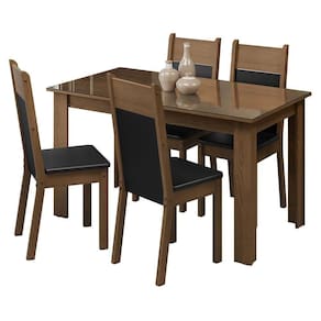 A mesa é retangular, com pés estruturais e acomoda perfeitamente até quatro pessoas. O vidro incolor sobreposto ao tampo de madeira deixa o ambiente ainda mais elegante.