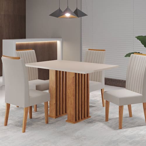 A Sala de Jantar Harper 120x80cm é uma opção elegante e funcional para ambientes modernos. A mesa, com tampo pintado em MDP de 25mm, oferece resistência e um design contemporâneo com canto reto. Sua base com detalhes ripados adiciona sofisticação e destaca a mesa no ambiente. As 4 cadeiras Fran, fabricadas em MDP/MDF, garantem estrutura robusta e estabilidade. O assento com espuma D26 proporciona conforto ideal durante as refeições, e o revestimento em tecido veludo traz um toque de luxo e aconchego. Perfeita para quem busca praticidade sem abrir mão da estética, a Sala de Jantar Harper transforma qualquer espaço, oferecendo um ambiente acolhedor e sofisticado. Um conjunto que combina beleza, durabilidade e conforto para momentos especiais. Medida da Mesa (A x L x P): A:82,5 x L:120 x P:80cm Peso da Mesa: 35,7 kg Mesa suporta até: 50.0000 Acabamento da Cadeira/Banco: Pintura UV Acabamento da Mesa: Pintura UV Acompanha Manual de Instalação: Sim Ambiente Principal: Sala de Jantar Cadeira/Banco Estofada: Encosto e Assento Estofados Cadeira/Banco estofada: Encosto e Assento Estofados Cadeira/Banco suporta até: 90.0000 codigo_ean: 7900288153449 Complexidade da Montagem: Média: pode ser montado por mais de uma pessoa e/ou necessite de maior conhecimento para montagem Configuração do Conjunto: Mesa com Cadeiras Cor: Mel/ Blonde /Pastel Cor das Cadeiras: Bege Cor do Produto: Mel/ Blonde /Pastel Cor Secundária: Bege De Canto (Canto Alemão): Não Enchimento do Assento: Espuma D-26 Enchimento do Encosto: Espuma D-12 Escala de Brilho: Semi-Brilho Espessura do Tampo: 25 mm Estrutura do Assento: MDP Estrutura do Encosto: MDP Formato do Tampo: Retangular Informações Complementares: Sala de Jantar 4 lugares Itens Inclusos: 1 Mesa, 4 Cadeiras, Kit Ferragem e Manual de Montagem Largura do Conjunto: 120 cm Linha ou Coleção: Fran Manual de Montagem e Instalação: https://product-hub-prd.madeiramadeira.com.br/992479/documents/6bae3802-d8c2-456f-b7f7-539d67afc086282240252817442282049886.pdf Marca: Viero Material da Base da Mesa: MDP Material da Estrutura da Cadeira: MDF/MDP Material do Tampo: MDP Material Principal: MDF/MDP Material Principal das Cadeiras/Bancos: MDF/MDP Medida da Cadeira/Banco (A x L x P): A:101 x L:42 x P:58,5cm Medida do Tampo (L x C x E): L:120 x C:80 x E:2,5cm Mesa Extensível: Não Necessita Montagem: Sim Origem do Produto: Nacional Peso da Cadeira/Banco: 8 kg Possui Apoio Para os Pés: Não Possui Vidro: Não Profundidade do Conjunto: 80 cm Quantidade de Cadeiras: 4 Quantidade de Lugares: 04 Recomendações de Uso, Manutenção e Limpeza: limpar com pano levemente umedecido em água Revestimento da Cadeira/Banco: Veludo Sistema de Montagem: Parafusos,cavilhas