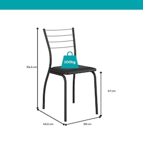 Medidas: Largura: 39 cm | Altura: 84,5 cm | Profundidade: 45,5 cm Altura até o assento: 47 cm Peso: 3,54 Kg Estrutura: Tubos de aço Assento: Estofado Encosto: Aramado Montagem: Soldada Ponteira: Plástica Peso suportado: Até 100 Kg