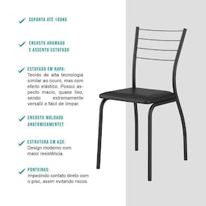 Altura das cadeiras: 84,5 cm | Estado de Origem: RS | Cor Via Varejo: Marrom | Família da Cor: Marrom | Cor: Preto | Peso: 33,51 | Código universal de produto: 2999 | Fabricante: Móveis Carraro | Marca: Móveis Carraro | Profundidade das cadeiras: 45,5 cm | Quantidade de cadeiras: 4 | Largura do produto cadeiras (cm): 39 cm | Altura da mesa (cm): 76,2 cm | Comnto da mesa (cm): 120 cm | Material das cadeiras: Napa | Modelo: Valência | Requer montagem: Sim | Formato da mesa: Retangular | Largura do produto mesa (cm): 80 cm | Material da mesa: MDP/Aço | Altura (cm): 84,5 cm | Largura do produto (cm): 120 cm | Profundidade (cm): 80 cm | Produto: Conjunto de Mesa e Cadeira | Nome Simples no Fornecedor: Conjunto Sala de Jantar 4 Cadeiras Valência Carraro Freijó | Instruções/Cuidados: Nenhuma Informação | Conteúdo da Embalagem: 1 Conjunto Sala de Jantar 4 Cadeiras Valência Carraro Freijó | Peso do Produto com Embalagem (kg): 33,51 kg | Altura do Produto com Embalagem (cm): 89 cm | Largura do Produto com Embalagem (cm): 85,50 cm | Comnto do Produto com Embalagem (cm): 125,5 cm | Descrição do Tamanho: 89 cm x 85,5 cm x 125,5 cm | PrazoExp: 2