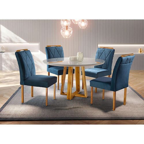 Conjunto Sala de Jantar 4 Lugares em Madeira Maciça Mesa Redonda 1,0m e 4 Cadeiras Azul Turquesa Escuro Moveis Mix