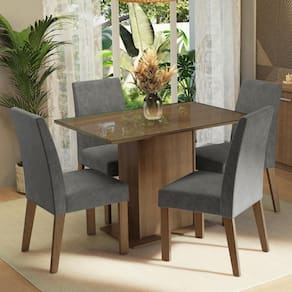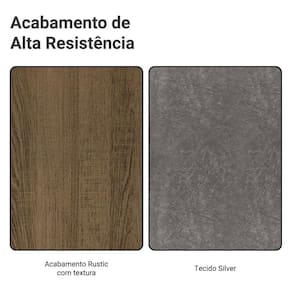 Com acabamento amadeirado Rustic e cadeiras estofadas em tecido Silver, com espuma de alta densidade, ele combina conforto e um visual contemporâneo.
