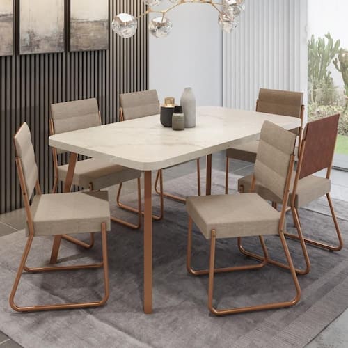 O Conjunto Sala de Jantar 6 Cadeiras Almería Carraro é uma fusão de conforto e estilo contemporâneo. A cadeira 1736 foi desenvolvida para atender às necessidades do usuário que preza por uma bela sala de jantar. Com linhas simples e transmitindo modernidade, ela se encaixa facilmente em diversos estilos de ambientes. Além disso, possui encosto e assento estofados, trazendo conforto e harmonia ao espaço em que será inserida. A mesa de jantar maior 1597 é a melhor opção para casas com famílias grandes ou muitos convidados. Elas comportam bem 6lugares, se encaixa facilmente em ambientes com personalidade. Trazendo a sensação de aconchego para o ambiente com a combinação de acabamento em BP e tubo de aço.