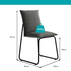 Medidas: Largura: 46 cm | Altura: 87 cm | Profundidade: 56 cm | Altura do assento: 48 cm Peso: 13,8 Kg Estrutura: Tubos de aço Assento: Estofado Encosto: Estofado Ponteira: Plástica Montagem: Soldada Peso suportado: Até 100 Kg