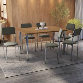 Transforme sua sala de jantar com o Conjunto Kappesberg, que une sofisticação, resistência e conforto em um design moderno. Composto por uma mesa com tampo de madeira MDF e 6 Cadeiras estofadas em Corino Cinza, este conjunto é ideal para quem busca elegância e funcionalidade no dia a dia. PRINCIPAIS BENEFÍCIOS: Design Moderno e Sofisticado: Perfeito para ambientes contemporâneos. Estrutura Resistente: Fabricado com materiais de alta durabilidade e qualidade. Conforto Garantido: Cadeiras estofadas com espuma D-26 para mais comodidade nas refeições. Acabamento Premium: Estrutura cromada com polimento 100%, resistente e brilhante. Ideal para até 6 pessoas: Perfeito para refeições em família ou com convidados.