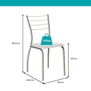 Altura das cadeiras (cm): 84,5 cm | Estado de Origem: RS | Cor Predominante: Prata | Cor do tampo: Freijó | Cor do assento: Branco | Cor da estrutura: Prata | Peso do produto (kg): 40.380000000000003 | Fabricante: Móveis Carraro | Marca: Móveis Carraro | Profundidade das cadeiras (cm): 45,5 cm | Quantidade de cadeiras: 6 | Largura das cadeiras (cm): 39 cm | Altura da mesa (cm): 76,2 cm | Comnto da mesa (cm): 120 cm | Material das cadeiras: Metal | Modelo: Valência | Requer montagem: Sim | Formato da mesa: Retangular | Largura da mesa (cm): 80 cm | Material da mesa: MDP | Altura do produto (cm): 84,5 cm | Largura do produto (cm): 120 cm | Profundidade do produto (cm): 80 cm | Produto: Conjunto de Mesa e Cadeira | Nome Simples no Fornecedor: Conjunto Sala de Jantar 6 Cadeiras Valencia Carraro Branco Prata | Instruções/Cuidados: Limpeza com pano seco. | Conteúdo da Embalagem: 1 Mesa e 6 Cadeiras | Peso do Produto com Embalagem (kg): 40,38 kg | Altura do Produto com Embalagem (cm): 80 | Largura do Produto com Embalagem (cm): 77.5 | Comnto do Produto com Embalagem (cm): 78 | Descrição do Tamanho: 84,5 cm x 80 cm x 120 cm | PrazoExp: 2 | Material para Filtro: Metal | Tipo de Produto: Doméstico | Número de Itens: 7 | Assembly Required: Sim | Included Components: Mesa e Cadeiras | External Certification: Não Aplicável | Frágil: Sim | Bullet Point 0: Cadeiras com assento estofado em MDP e design curvilíneo moderno. | Bullet Point 1: Estrutura em tubos de aço e acabamento em pintura epóxi. | Bullet Point 2: Acompanha sapatas que protegem o piso e evitam ruídos. | supplier_declared_dg_hz_regulation: Não Aplicável | Bullet Point 3: Mesa com tampo de MDP de 25mm, suporta até 30 kg. | Bullet Point 4: Cadeiras suportam até 100 Kg e tem a estrutura soldada. | Model Number: 1 | number_of_boxes: 5 | part_number: 1 | batteries_required: não