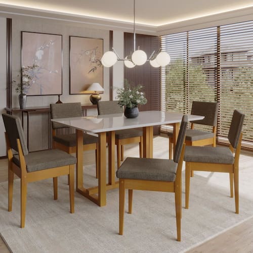 A Cadeira Miami é puro estilo e qualidade. Sua estrutura é produzida com 100% de madeira de eucalipto, sem contar na qualidade e toque macio dos tecidos. Medida da Mesa (A x L x P): 78cm x 160cm x 90cm Peso da Mesa: 49,4 kg Mesa suporta até: 130 kg Acabamento da Cadeira/Banco: Pintura UV Acabamento da Mesa: Pintura UV Acompanha Manual de Instalação: Sim Almofada do assento: Fixa Altura do Conjunto: 78 cm Ambiente Principal: Sala de Jantar Cadeira/Banco Estofada: Encosto e Assento Estofados Cadeira/Banco estofada: Encosto e Assento Estofados Cadeira/Banco suporta até: 130 kg Cadeira/Banco Suporta Até: 130.0000 codigo_ean: 7897904154181 Complexidade da Montagem: Média: pode ser montado por mais de uma pessoa e/ou necessite de maior conhecimento para montagem Configuração do Conjunto: Mesa com Cadeiras Cor: Cerejeira/Grafite/Off White Cor da Base: Laranja Cor das Cadeiras: Laranja Cor do Produto: Cerejeira/Grafite/Off White Cor do Tampo: Off White Cor Secundária: Cinza De Canto (Canto Alemão): Não Design da Base: Quadrado Enchimento do Assento: Espuma D-23 Enchimento do Encosto: Espuma D-23 Escala de Brilho: Brilhante Espessura do Tampo: 25 mm Estrutura do Assento: Espuma Formato do Tampo: Retangular Itens Inclusos: 1 Mesa, 6 Cadeiras, Kit Ferragens e Manual de Montagem Largura do Conjunto: 90 cm Linha ou Coleção: Filadélfia / Miami Manual de Montagem e Instalação: https://product-hub-prd.madeiramadeira.com.br/185333748/documents/9171e541-3928-441e-9c65-484ddf0819643162842528417562364755531.pdf Marca: Móveis Meneghetti Material da Base da Mesa: Madeira Maciça Material da Estrutura da Cadeira: Madeira Maciça Material do Tampo: MDF Material Principal: Madeira Eucalipto Material Principal das Cadeiras/Bancos: Madeira Maciça Medida da Base (A x L x P): 77cm x 51cm x 110cm Medida da Cadeira/Banco (A x L x P): 93cm x 44cm x 54cm Medida do Tampo (L x C x E): 90cm x 160cm x 2,5cm Mesa Dobrável: Não Mesa Extensível: Não Necessita Montagem: Sim Origem do Produto: Nacional Peso da Cadeira/Banco: 7,5 kg Possui Apoio para Braços: Não Possui Apoio Para os Pés: Não Possui Prateleiras: Não Possui Suporte Giratório: Não Possui Vidro: Sim Profundidade do Conjunto: 160 cm Quantidade de Cadeiras: 6 Quantidade de Lugares: 06 Recomendações de Uso, Manutenção e Limpeza: Limpar com pano seco e limpo. Revestimento da Cadeira/Banco: Linho Sistema de Montagem: Parafusos e cavilhas. Tipo de Assento: Fixo Tipo de Encosto: Fixo Tipo de Madeira Maciça da Base da Mesa: Eucalipto Marca: Não Informado