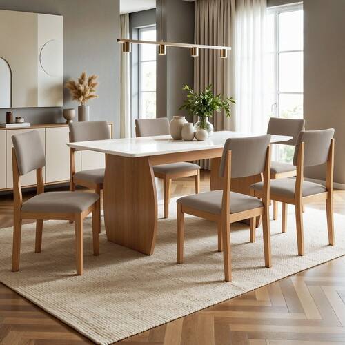 O que são bordas chanfradas? As bordas chanfradas são levemente inclinadas, em vez de retas, o que confere um acabamento mais refinado, moderno e seguro, suavizando o toque e prevenindo lascas. Medida da Mesa (A x L x P): 78x160x80 Peso da Mesa: 52,4 kg Mesa suporta até: 40 kg Acabamento da Cadeira/Banco: Pintura UV Acabamento da Mesa: Pintura UV Acompanha Manual de Instalação: Sim Almofada do assento: Fixa Ambiente Principal: Sala de Jantar Cadeira/Banco estofada: Somente Assento Estofado Cadeira/Banco Estofada: Somente Assento Estofado Cadeira/Banco suporta até: 120 kg Cadeira/Banco Suporta Até: 120.0000 codigo_ean: 7900288363626 Complexidade da Montagem: Média: pode ser montado por mais de uma pessoa e/ou necessite de maior conhecimento para montagem Configuração do Conjunto: Mesa com Cadeiras Cor: Cinamomo/Off White/Bege Cor da Base: Cinamomo Cor das Cadeiras: Bege Cor do Produto: Cinamomo/Off White/Bege Cor do Tampo: Off White Cor Secundária: Bege De Canto (Canto Alemão): Não Escala de Brilho: Fosco Espessura do Tampo: 25 mm Espessura do Vidro: 4 mm Estrutura do Assento: Madeira Maciça Formato do Tampo: Retangular Itens Inclusos: 1 Mesa, 6 Cadeiras, Kit Ferragem e Manual de Montagem Linha ou Coleção: Carol Manual de Montagem e Instalação: https://product-hub-prd.madeiramadeira.com.br/208126078/documents/42b2707e-e92e-43ae-a650-dd11c33a3cde345933873217744521129039.pdf Marca: Valdemóveis Material da Base da Mesa: MDF Material da Estrutura da Cadeira: Madeira Maciça Material do Tampo: Vidro Material Principal: Madeira Maciça Material Principal das Cadeiras/Bancos: Madeira Maciça Medida da Cadeira/Banco (A x L x P): 91x45x50 Medida do Tampo (L x C x E): 25x160x80 Mesa Extensível: Não Necessita Montagem: Sim Origem do Produto: Nacional Peso da Cadeira/Banco: 14,5 kg Possui Apoio Para os Pés: Não Quantidade de Cadeiras: 6 Quantidade de Lugares: 06 Recomendações de Uso, Manutenção e Limpeza: Recomendamos que a limpeza seja feita apenas com pano umedecido. Sistema de Montagem: Parafusos. Tipo de Encosto: Fixo Vidro Temperado: Sim