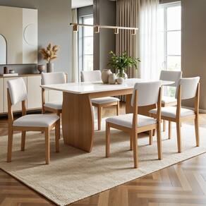 O que são bordas chanfradas? As bordas chanfradas são levemente inclinadas, em vez de retas, o que confere um acabamento mais refinado, moderno e seguro, suavizando o toque e prevenindo lascas. Medida da Mesa (A x L x P): 78x160x80 Peso da Mesa: 52,4 kg Mesa suporta até: 40 kg Acabamento da Cadeira/Banco: Pintura UV Acabamento da Mesa: Pintura UV Acompanha Manual de Instalação: Sim Almofada do assento: Fixa Ambiente Principal: Sala de Jantar Cadeira/Banco estofada: Somente Assento Estofado Cadeira/Banco Estofada: Somente Assento Estofado Cadeira/Banco suporta até: 120 kg Cadeira/Banco Suporta Até: 120.0000 codigo_ean: 7900288363657 Complexidade da Montagem: Média: pode ser montado por mais de uma pessoa e/ou necessite de maior conhecimento para montagem Configuração do Conjunto: Mesa com Cadeiras Cor: Cinamomo/Off White/Palha Cor da Base: Cinamomo Cor das Cadeiras: Bege Cor do Produto: Cinamomo/Off White/Palha Cor do Tampo: Off White Cor Secundária: Bege De Canto (Canto Alemão): Não Escala de Brilho: Fosco Espessura do Tampo: 25 mm Espessura do Vidro: 4 mm Estrutura do Assento: Madeira Maciça Formato do Tampo: Retangular Itens Inclusos: 1 Mesa, 6 Cadeiras, Kit Ferragem e Manual de Montagem Linha ou Coleção: Carol Manual de Montagem e Instalação: https://product-hub-prd.madeiramadeira.com.br/752316953/documents/eacef83c-e5ae-4240-88e9-b46093eb0052345939273217744523451475.pdf Marca: Valdemóveis Material da Base da Mesa: MDF Material da Estrutura da Cadeira: Madeira Maciça Material do Tampo: Vidro Material Principal: Madeira Maciça Material Principal das Cadeiras/Bancos: Madeira Maciça Medida da Cadeira/Banco (A x L x P): 91x45x50 Medida do Tampo (L x C x E): 25x160x80 Mesa Extensível: Não Necessita Montagem: Sim Origem do Produto: Nacional Peso da Cadeira/Banco: 14,5 kg Possui Apoio Para os Pés: Não Quantidade de Cadeiras: 6 Quantidade de Lugares: 06 Recomendações de Uso, Manutenção e Limpeza: Recomendamos que a limpeza seja feita apenas com pano umedecido. Sistema de Montagem: Parafusos. Tipo de Encosto: Fixo Vidro Temperado: Sim